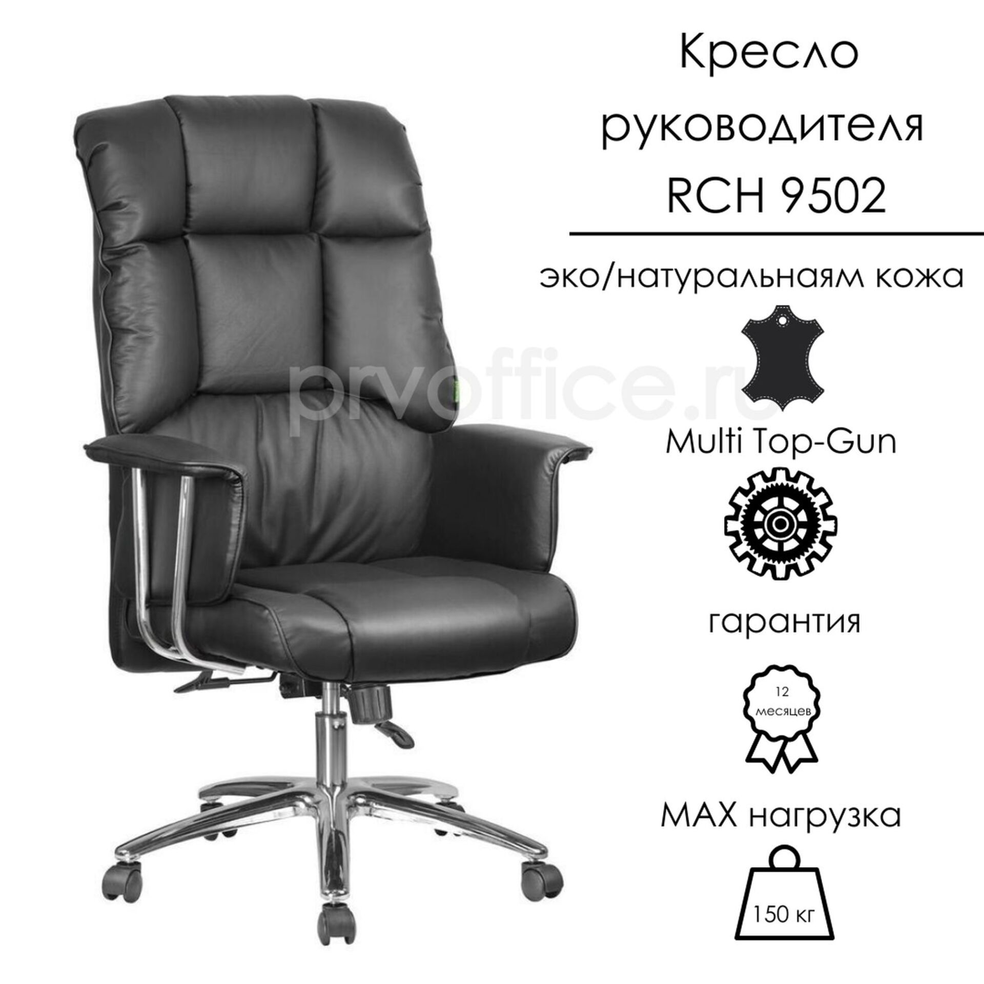 Кресло руководителя RCH 9502 - офисное кресло из высококачественных материалов, которое подойдет под любой интерьер. Хромированные опоры c механизмом Multi Top-Gun позволяют регулировать жесткость качания и зафиксировать кресло в удобном для Вас положении. Немаловажный факт – максимальная нагрузка до 150 кг. На ваш выбор два варианта исполнения – натуральная кожа и экокожа – в двух цветах (черный и кремовый).