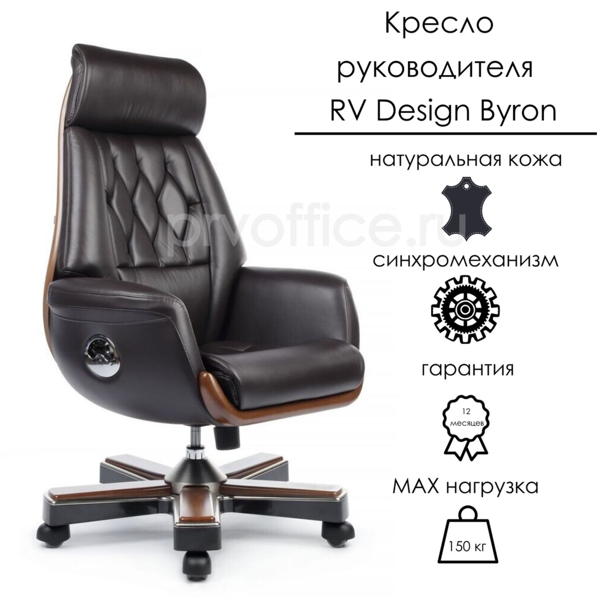 Кресло руководителя премиум-класса RV Design Byron - невероятно удобное офисное кресло из натуральной кожи. Комфорт, обтекаемые формы и эффектный дизайн кресла Byron несомненно придутся по вкусу ценителям классического стиля в интерьере, а вставки, имитирующие натуральное дерево, добавят благородности вашему пространству. Встроенный синхромеханизм свободного качания обеспечит фиксацию кресла в пяти положениях, а эффект "анти-шок" позволит избежать удара или неожиданного "опрокидывания" спинки при снятии блокировки. Предельная нагрузка - 150 кг.